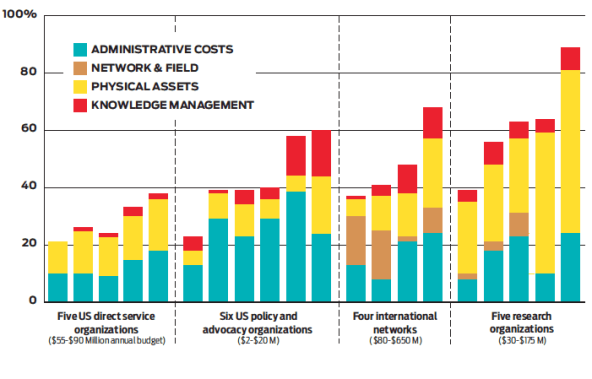 With indirect costs as our guide, we examined the financial records of a sample of nonprofits that included domestic and global organizations with annual budgets ranging from $2 million to $650 million. Regardless of their missions, which varied greatly, indirect costs fell into four general categories: administrative expenses, network and field, physical assets, and knowledge management. Because nonprofits can have very different funding models, we decided not to include fundraising costs as indirect costs.